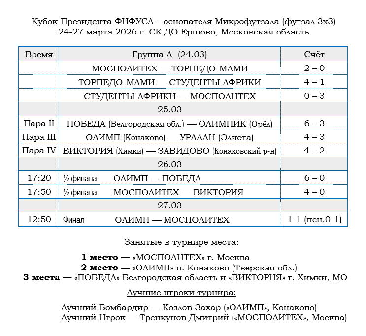 Кубок Президента ФИФУСА – основателя Микрофутзала (футзал 3х3). Мужские команды